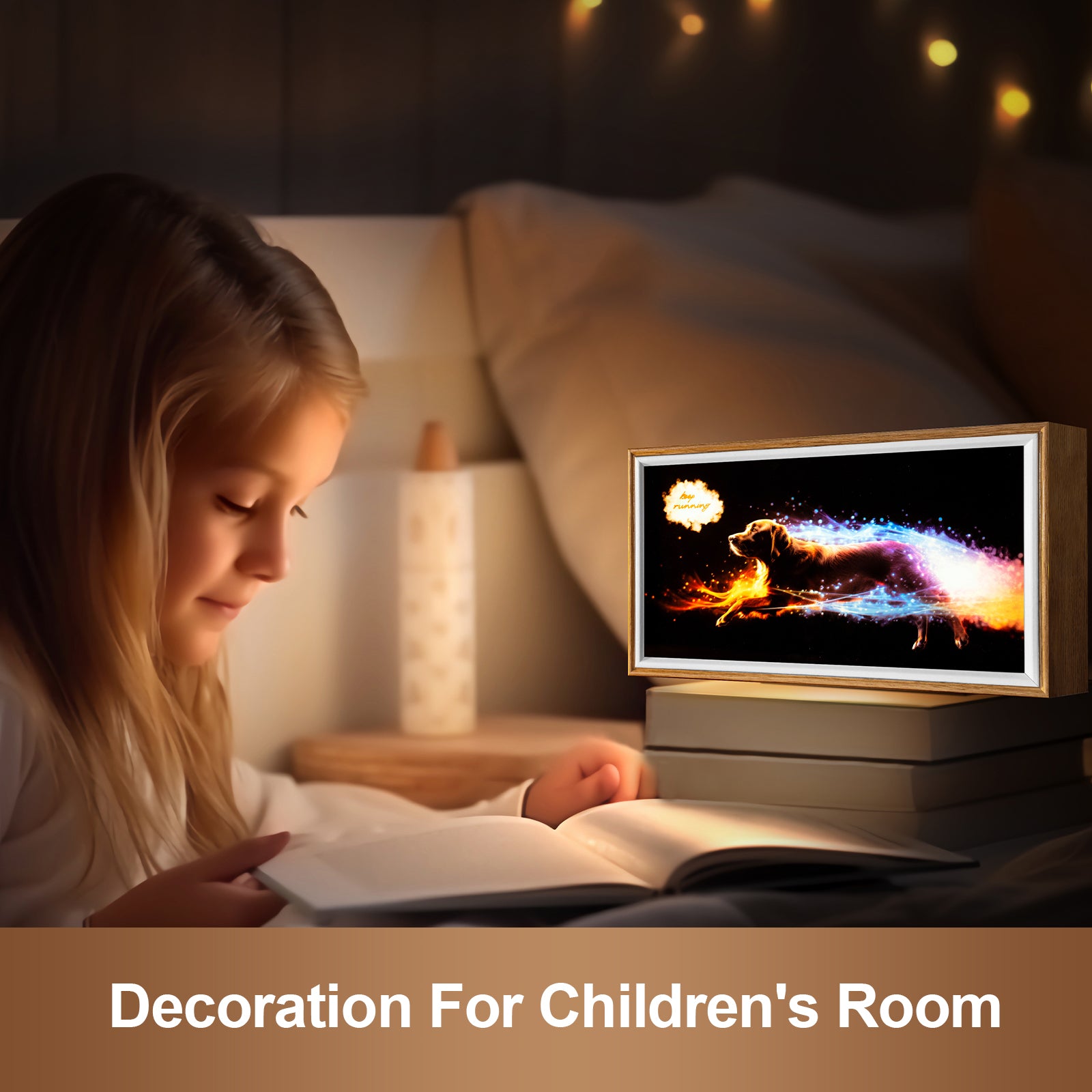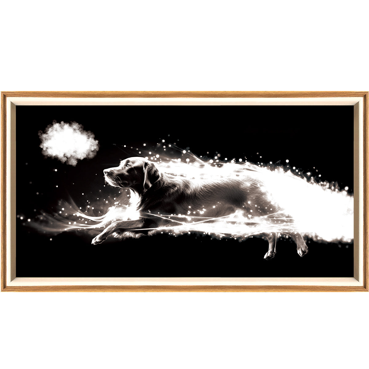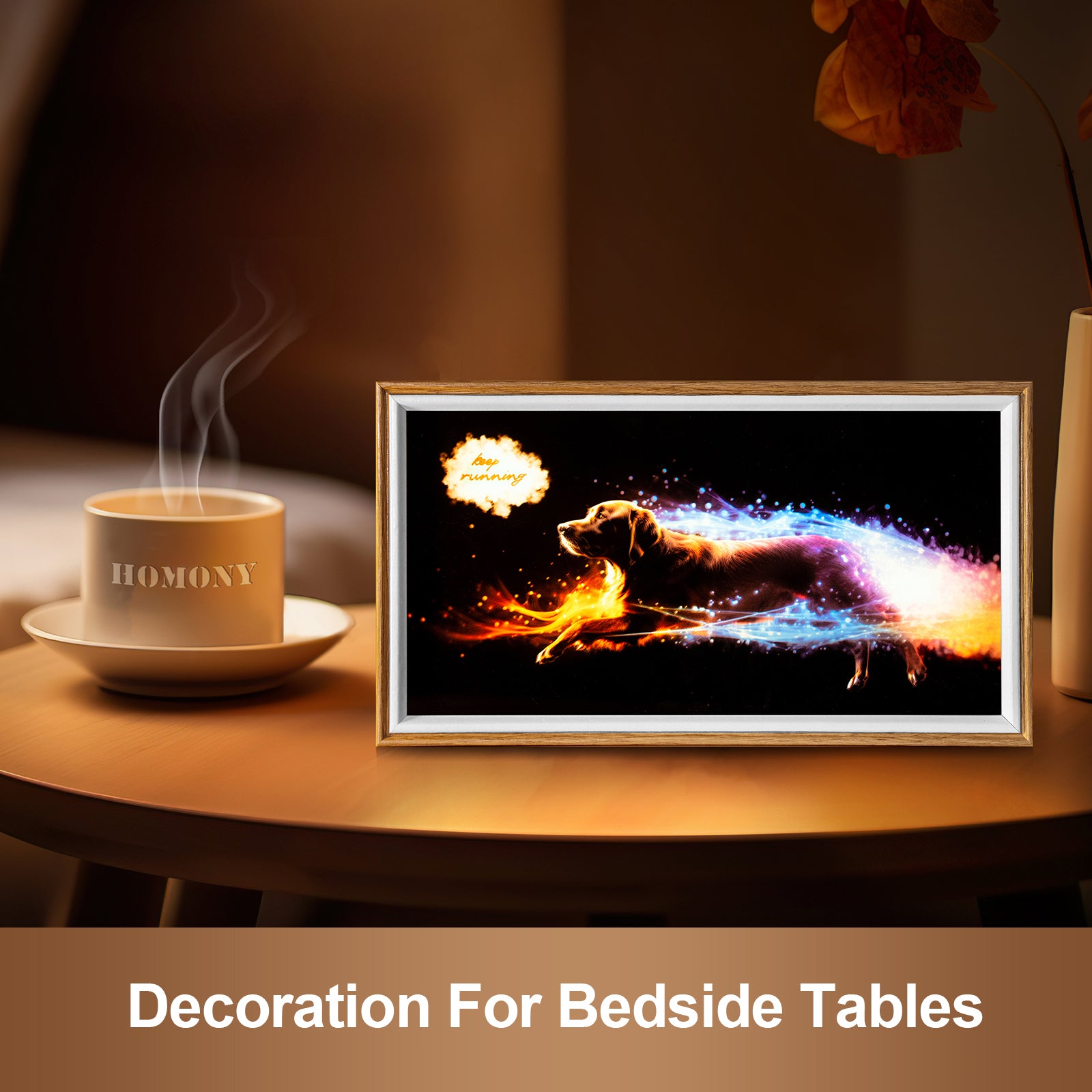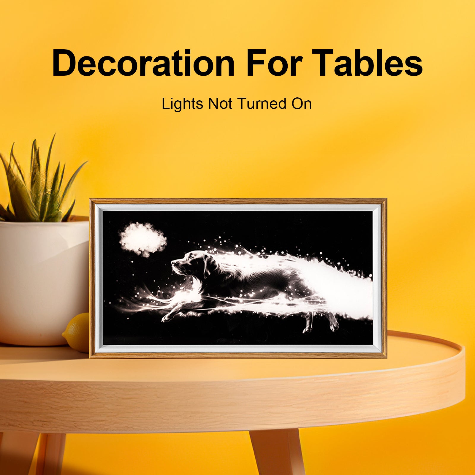 Introducing our unique 'Running Dog' LED Light Painting Artwork, a piece that adds a touch of whimsy to your environment. In its unlit state, it showed a running dog, but when the lights come on, the lights of rainbow light behind will catch your eye. This artwork brings a delightful surprise and charm to your room. Whether you're a animal enthusiast or someone who appreciates imaginative art, this piece will bring joy to your space!